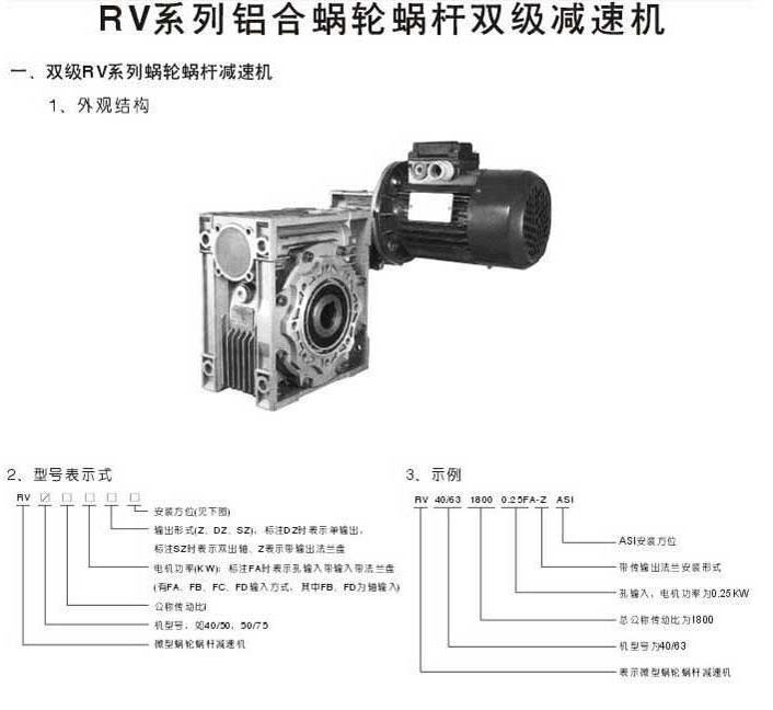 RV系列鋁合金蝸輪蝸桿雙級減速機雙級RV系列鋁合金蝸輪蝸桿減速機外觀結(jié)構(gòu)型號表示法